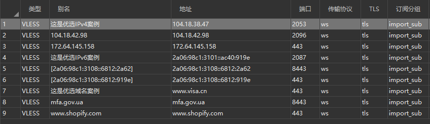 缺少备注时,将直接显示IP域名。更多优选域名可通过CloudFlare 优选域名汇总获取;